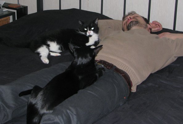 | Pojat syksyllä 2011. Viimeisiä kuvia Oliverista. | Tau leipälaatikon päällä. Eihän meillä kissat pöydillä kulje... ;) |