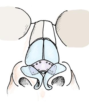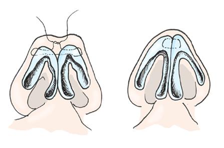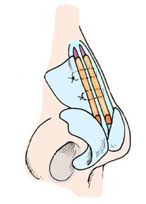 Nenän keskiholvi muodostuu ylälateraalirustoista. Eksterni avaus mahdollistaa ylälateraalirustojen irrottamisen septumista ja fiksoinnin ompelein. Spreadergrafti tulee tavallisesti koveralle puolelle. Spreadergrafti on pitkä rustopalkki, joka on yleensä saatavissa septumrustosta mutta tarvittaessa sellaisen voi valmistaa korvalehden konkkakuopankin rustokappaleita yhdistelemällä. Spreadergrafti kiinnitetään ylälateraaliruston ja septumin yläreunan väliin antamaan tukea nenän selälle. Spreadergrafti väljentää valve-aluetta ja nenän rustoista holvia ja estää ylälateraalirustojen sisäänpainumista. Ns. ekstensiograftilla voidaan dorsaalista palkkia pidentää. Ekstensiografti muodostuu kahdesta pitkästä spreadergraftista.
