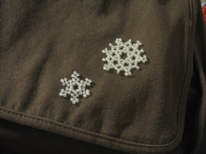Laukku päivittyi vuodenaikaan sopivaksi (mehiläinen oli jo aika kohmeessa), hiutaleet oman mallin mukaan, isompi Sandra D. Halpennynilmaisen mallin innoittama
