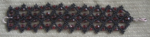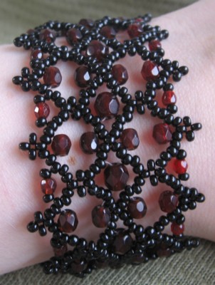 "Crystal lace" gone apes :D Garnet coloured fire-polished beads (3,4 & 5mm), 10/0 black Czech seeds. Original.