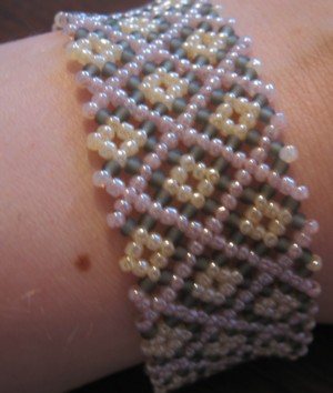 Tähän rannekkeeseen pienensin Vera-Aleksan mallia (alkuperäistä käytin tähän rannekkeeseen). Suunnittelupohja tämän koon verkkoon (muistaakseni Emily Hackbarthin tekemä)